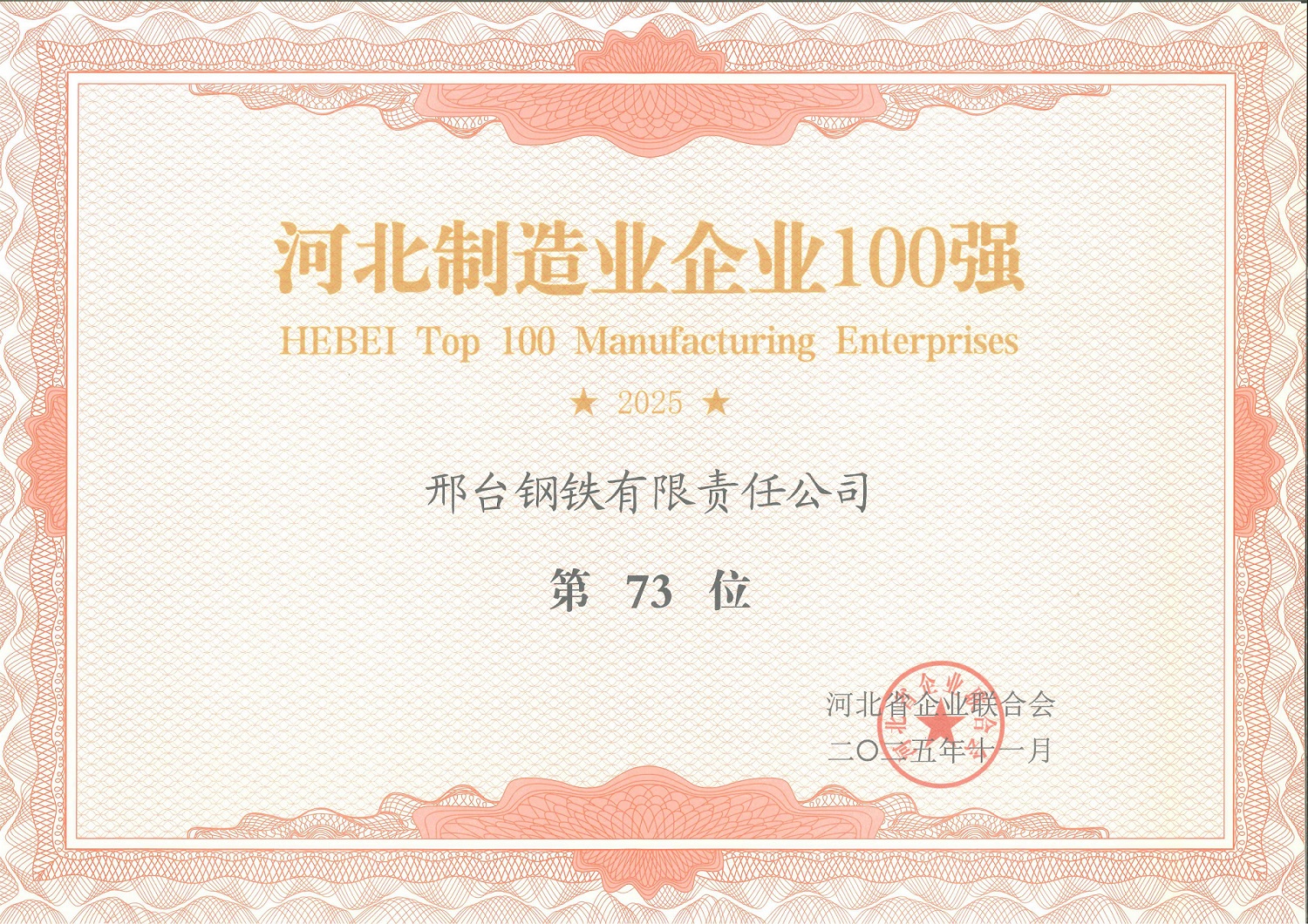 2025年11月,邢鋼在冶金安全電子公文傳輸系統(tǒng)管理工作中表現(xiàn)突出,被中國鋼鐵工業(yè)協(xié)會評為先進單位。
