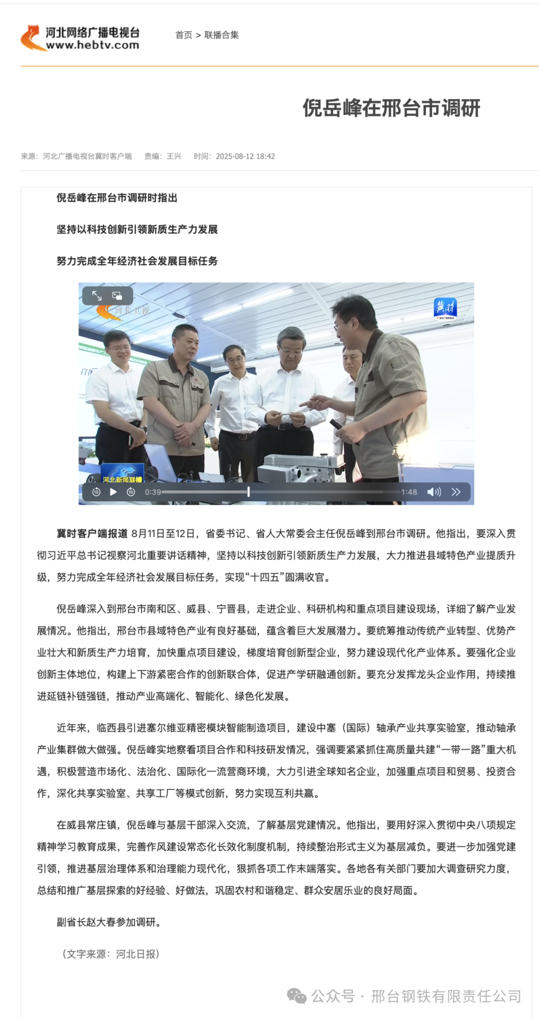冀時客戶端報道 8月11日至12日,省委書記、省人大常委會主任倪岳峰到邢臺市調(diào)研。他指出,要深入貫徹習近平總書記視察河北重要講話精神,堅持以科技創(chuàng)新引領新質(zhì)生產(chǎn)力發(fā)展,大力推進縣域特色產(chǎn)業(yè)提質(zhì)升級,努力完成全年經(jīng)濟社會發(fā)展目標任務,實現(xiàn)“十四五”圓滿收官。